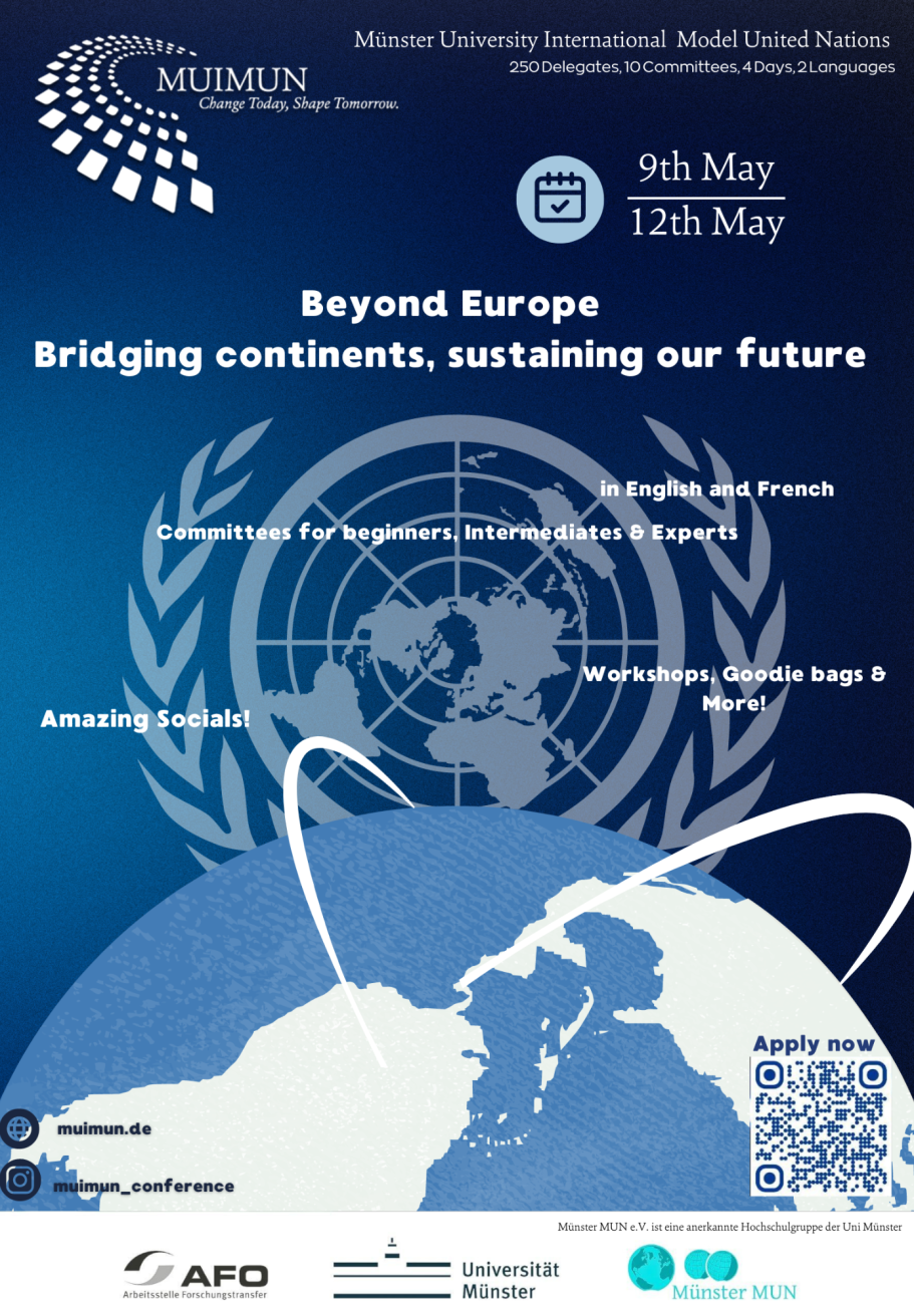 The non-profit Münster MUN e. V. (German registered association) supports the MUIMUN project actively, especially with a staff (the volontarily working MUIMUN organization team) and ideally. Additionally, it also helps in funding the project.